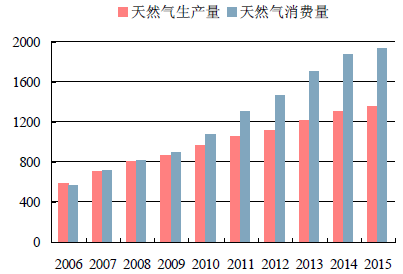 近年來(lái)隨著城市化進(jìn)程的加快和環(huán)境保護(hù)要求的提高,天然氣作為一種清潔高效的能源,被大量利用于城市燃?xì)夂吞娲加汀⑷斯っ簹獾裙I(yè)燃料。國(guó)家統(tǒng)計(jì)局?jǐn)?shù)據(jù)顯示,2005年至2015年期間,全國(guó)天然氣生產(chǎn)量由493億立方米增長(zhǎng)至1350億立方米,消費(fèi)量由468億立方米增長(zhǎng)至1931億立方米,十年復(fù)合年均增長(zhǎng)率分別為10.6%和15.2%。