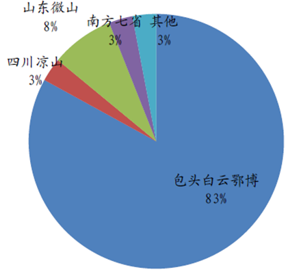 3、我國稀土資源整體呈現(xiàn)南重北輕的特點。北方以包頭的白云鄂博礦為代表,主要生產(chǎn)輕稀土,其儲量超過全國的80%;南方礦點則比較分散,主要為分布于江西、廣東、福建、湖南、廣西等南方省區(qū)的離子型稀土礦,以重稀土為主,其儲量占我國重稀土資源的90%。