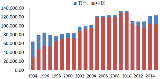 4、近20年來,全球稀土產(chǎn)量總體呈現(xiàn)穩(wěn)定增長趨勢,2011-2013年受到中國產(chǎn)量減少影響,全球產(chǎn)量出現(xiàn)下滑,但從2014年開始,總產(chǎn)量出現(xiàn)恢復性增長,到2015年已經(jīng)達到12.4萬噸。 作為中國的戰(zhàn)略性優(yōu)勢資源,2011年以前,中國稀土產(chǎn)量的全球占比逐漸增大,最高達到97.7%;2011年之后這一比例雖然有所下降,但2015年的全球占比仍然高達85%,這意味著中國在以全球41%的儲量供給全球85%的需求。