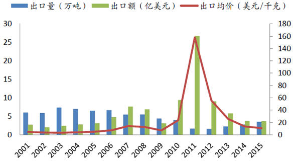 2015年以來,隨著出口配額的取消,我國稀土產(chǎn)品出口量持續(xù)增加,2016年3月月度達到出口4343噸,較2015年1月的1457噸增長198%,而出口均價卻由13.89萬元/千克降至7.26萬美元/千克,降幅達高達47.7%。