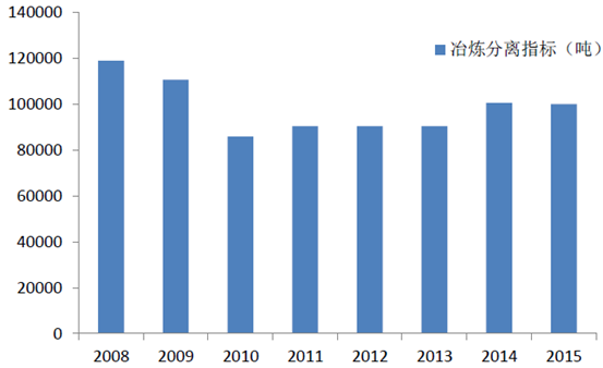 6、我國稀土氧化物開采指標近10年來整體保持小幅增加,2015年達到10.5萬噸;冶煉分離指標從2010年開始也有一定幅度增加,到2015年達到10.01萬噸。