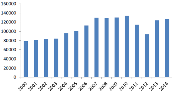 我國2015年以前實施的出口配額政策在一定程度上控制了合法稀土出口量和出口價格。進入21世紀以來,我國不斷加強稀土的出口管理,稀土出口量呈現(xiàn)下降趨勢,出口價格和出口額穩(wěn)中有升。 自2011年以來,稀土出口量從1.69萬噸增加到2014年的2.78萬噸,均價卻下跌超過90%。進入2015年,稀土出口量更是達到3.48萬噸,同比增長25.2%,出口均價10.7美元/千克,同比下降20.7%。