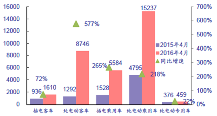 乘用車產量保持了一直以來的高增速,前4個月純電動乘用車和插電式混合動力乘用車的累計產量分別同比增長149%和89%,且消費結構不斷趨于高端化,今年前4個月較為低端的A00級微型電動車銷量占比由2015年的63%大幅降低至30%,而較高端的A級純電動乘用車4月銷量同比暴增534%,前4個月累計銷量同比增長451%。插電式混動方面,受比亞迪唐熱銷的影響,B級車的比重也由2015年的32%提升到今年前4個月的62%。