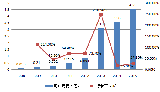 2008-2015中國移動游戲用戶規模