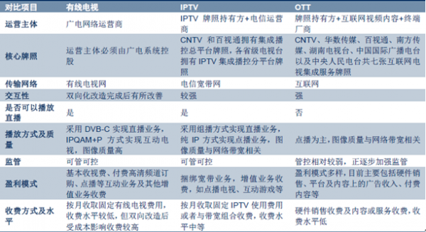 2、IPTV的內容組織與集成播控依然是傳統的廣電播出機構負責,只不過內容傳輸渠道從傳統的有線網絡變成了電信寬帶。不考慮部分落后地區,IPTV與有線電視在內容上的差異并不大,也均可以提供直播服務,因此兩者存在直接競爭,用戶只會選擇一種服務。但互聯網電視的用戶拓展直接憑借硬件銷售即可完成,消費者購買電視即成為用戶,打開觀看的內容也基本集中在互聯網視頻領域,其發展邏輯相對獨立于有線與IPTV,并不沖突。因此用戶常見的搭配是購買互聯網電視,然后在有線電視服務與IPTV中二選一。