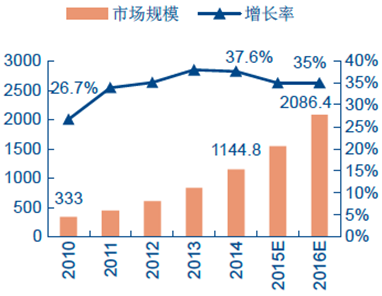 2010-2016年國內游戲產業市場規模(單位:億元)
