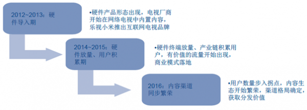 回歸互聯網電視的產業邏輯與分析框架,產業鏈兩端的內容與渠道(終端)的發展階段決定了產業的繁榮程度。無論PC互聯網、移動互聯網、電視互聯網,甚至是未來的VR生態,均遵循著同一條成熟的路徑。首先是硬件形態的出現;之后隨著硬件終端數量的放量,產業鏈逐步積累起具備運營價值的用戶,圍繞著硬件形態及其背后潛在的內容形式,商業模式漸成雛形;用戶量步入拐點之后,內容生態不斷繁榮,收入規模開始快速增長,同時終端(渠道)開始獲取內容分發價值。而經歷了2012~13年的硬件形態導入期,以及2014~2015年的硬件終端放量期,電視互聯網的用戶量已經開始步入拐點,產業鏈正式進入繁榮初期。