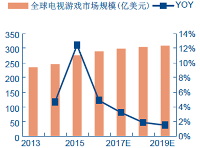 2013-2019年全球電視游戲市場規模(單位:億美元)