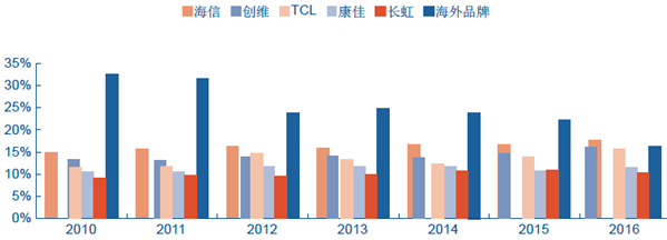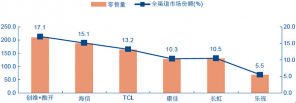 低價與內容難尋差異化,行業競爭重回傳統消費品牌要素,利好龍頭份額提升。由于低價銷售已經是電視產業常態,降價對消費者的刺激程度減弱;終端平臺整合的內容逐漸豐富,內容的差異化也日漸降低,不再是選購電視機時的主要考慮因素;ヂ摼W電視的終端競爭重新回歸消費品牌特征,產品力、品牌力、渠道與營銷水平等傳統競爭要素仍是主要矛盾。