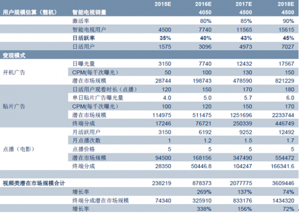 3、互聯網電視快速放量,用戶普及率突破10%關鍵點。2014年是互聯網電視第一個放量銷售的年份,當年智能電視銷售滲透率超過50%,行業累計存量接近3000萬臺左右,存量用戶滲透率達到5%。2015年,智能電視滲透率達到70%以上,電視互聯網累計用戶超過5000萬,滲透率跨越10%的關鍵點,龍頭公司單家激活終端數量接近1500萬臺,日均活躍用戶接近1000萬,達到規模運營起點。(注:用戶滲透率的定義是,智能電視存量占全部電視存量的比重)