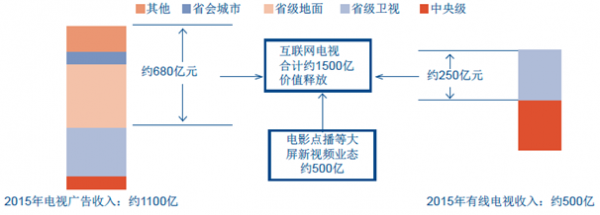 時間平均每天看傳統電視直播時長每天看互聯網電視節目時長20123 小時2 小時20132.5 小時2.5 小時20142 小時3 小時20151~1.5 小時3.5~4 小時4、隨著傳統電視廣告與收視市場價值轉移,以及部分新興業態快速成熟,互聯網電視產業鏈即將率先迎來近1500億市場價值的轉移和釋放。從傳統電視產業鏈轉移過來的價值包括1)傳統電視廣告的轉移:根據廣電總局、CTR媒介智訊數據以及我們自行估算,2015年廣電體系的電視廣告規模接近1100億元,其中中央級電視臺、省級衛視的內容與收視率競爭力依然較強,而省級地面電視臺、省會城市及其他地市級電視臺的競爭力持續下降,該部分占比達到62%,也即有680億元的廣告價值將開始以開機廣告、視頻貼片廣告的形式向互聯網電視轉移。2)傳統有線電視收視費的轉移:2015年,有線電視收視費規模超過500億元,假設中期有一半向互聯網電視轉移,對應約250億市場價值。