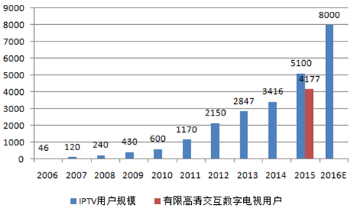 1、多重利好之下,IPTV用戶量在近半年高速發展至5000萬戶,已超過有線雙向交互的數字電視用戶(4000萬),且2016年有可能發展至8000萬以上量級。結合中國電信與中國聯通年報的統計數據,2015年,中國電信IPTV用戶量增長900萬,達到4000萬左右,聯通IPTV用戶達到1124萬,兩者相加超過5000萬,已經超過有線體系中可雙向交互的數字電視用戶。中國移動雖然目前沒有IPTV傳輸牌照,但獲得資質預計也只是時間問題,并且中國移動本身擁有規模龐大的用戶群體,也有利于未來IPTV業務的捆綁推廣。隨著三大運營商齊齊發力,2016年IPTV用戶預計將得到爆發增長,用戶規模接近億級。