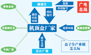 廣電總局對網絡機頂盒行業實行監管,并規定只有具有相應牌照的企業才有出品網絡盒子的資格。目前國內有七大牌照方:央廣銀河(GITV),中國網絡電視臺(CNTV),華數,百視通(BestTV),湖南廣電, 中國國際廣播電視網絡臺(CIBN)和南方傳媒(SMC)。