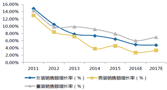 2011-2017中國童裝、男裝、女裝銷售額增長率