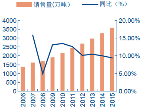 核心提示:二胎政策催化,銷售保持平穩增長。2015 年全國乳制品銷售額達3434 億元,同比增長14.2%,增速較2014 年略微下降0.63pcts;全年銷售量3577 萬噸,同比增長9.4%,增速較2014 年繼續下滑0.62pcts。總體來看,二胎政策催化,銷售保持平穩增長。2015 年全國乳制品銷售額達3434 億元,同比增長14.2%,增速較2014 年略微下降0.63pcts;全年銷售量3577 萬噸,同比增長9.4%,增速較2014 年繼續下滑0.62pcts。總體來看,2015 年乳制品行業受經濟下行壓力影響增速略有下降,但整體仍較平穩,期待全面二胎政策后續落實催化。