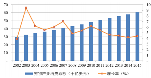 2002-2015 年美國寵物產業消費總額與同比增速