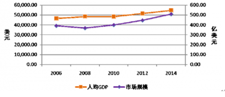 龐大的消費群體派生了巨大的市場需求,在2014 年,美國寵物食品與用品的市場規模已達507.43 億美元,并呈現出持續增長趨勢,具體如下: