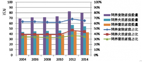 如上圖所示,除淡水魚呈下降趨勢外,其他各類別的寵物數量相對穩定,且保持在較大規模,至2014 年末,寵物犬的數量為7,780 萬只,寵物貓的數量為8,580 萬只。