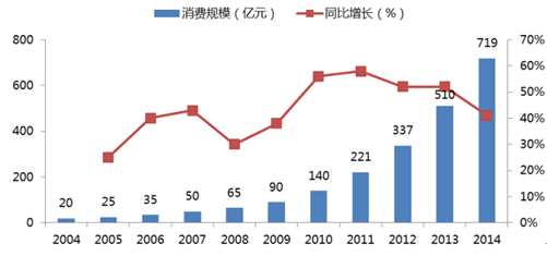 2004-2014 年國內寵物行業消費規模與同比增速