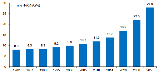 1979 年,《中共中央關于加快農業發展若干問題的決定》指出“努力實行計劃生育”,獨生子女政策開始正式推行。隨著獨生子女政策的推出,從 80 年代初開始,我國老年人口占比持續增長。1982 年我國老年人口撫養比僅為 8%,到 2014 年該數據已經增至 13.7%。根據全國老齡辦預測,我國老齡化進程將持續到 2050 年,屆時撫養比將達到 27.9%(注:老年撫養比=65 歲以上人口/ 15-64 歲人口*100%)。