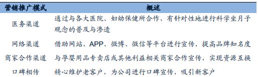 月子中心服務(wù)對象為產(chǎn)婦和新生兒這一特殊人群,服務(wù)時間一般為嬰兒出生后一個月內(nèi),針對某一單獨客戶的服務(wù)時間較短,不具有重復(fù)消費的特點,因而開發(fā)新客戶的頻率較高,導(dǎo)致該行業(yè)在營銷推廣方面的投入較大。目前月子中心的營銷推廣主要有醫(yī)務(wù)渠道、網(wǎng)絡(luò)渠道、商家合作渠道、口碑相傳這四種模式。