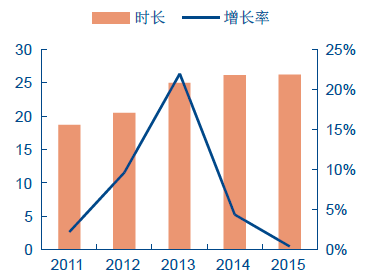 從網絡使用深度上看,2015年中國網民的人均周上網時長為26.2小時,較2014年底僅增長0.1小時,基本持平。從人群結構來看,網民中男女占比分別達到53.6%和46.4%,發展進一步均衡化。年齡結構方面,30歲以下的人群已經占到網民群體的54%。