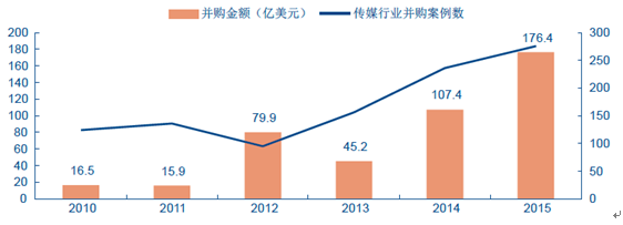 5、在傳統產業增長速度趨緩、互聯網市場高速擴張的背景之下,傳媒并購重組成為了2015年全年的熱點所在。2015年文化傳媒行業披露并購規模176.4億美元,披露并購案例276起,較2014年分別增長64.15%和16.95%。其中,包括影視、游戲、數字營銷、VR等多個子行業均呈現出較高的熱度。