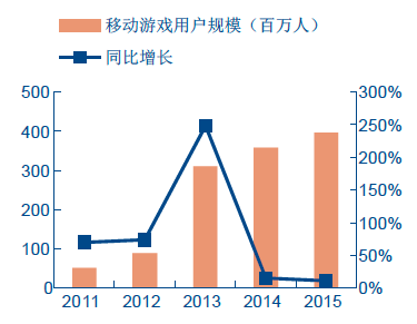 2015年,手游行業在經歷了以用戶數量增長帶來的銷售放量之后,正逐步進入用戶ARPU值驅動的發展新時期。截至年末,我國移動游戲用戶規模為3.96億人,同比僅增10.9%;實際銷售收入達514.6億元,同比增長87.2%,相較于2014年全年增速下滑57.4%。