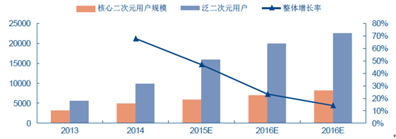 伴隨著消費意識的提升,中國的二次元人群正在逐步擴容,相關文化市場的熱情也在逐步攀升。調查數據顯示,2015年,我國二次元消費者規模或已逾2億,其中,核心用戶占比達到27.1%;且消費者人數有望在今后的幾年之內依然保持兩位數的快速增長。