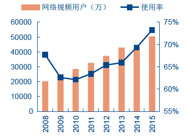 片名內地票房(億元)年份發行公司制作公司大圣歸來9.472015聚合影聯燕城十月/橫店熊出沒之雪嶺熊風2.962015樂視/珠江/卡通先生深圳華強/優揚傳媒熊出沒之熊心歸來2.882016樂視/珠江深圳華強/卡通先生熊出沒之奪寶熊兵2.472014樂視/珠江深圳華強/卡通先生喜羊羊與灰太狼之開心闖龍年1.662012上海東方原創動力喜洋洋與灰太狼之兔年頂呱呱1.52011上海東方原創動力喜羊羊與灰太狼之虎虎生威1.282010上海東方原創動力喜羊羊與灰太狼之喜氣羊羊過蛇年1.252013上海東方原創動力十萬個冷笑話1.22015萬達/上海炫動有妖氣/上海炫動喜羊羊與灰太狼之牛氣沖天0.92009上海東方原創動力4、從媒介的角度來看,中國的ACGN群體是與網絡建設同步成長起來的一代,因此其交互的社群對于網絡媒介有著極高的依存度。物聯網/移動互聯網為代表的新媒體的崛起,對于內容產業的沖擊是多方面的。一方面,截至2015年底,我國網絡視頻的用戶數目已經達到5.04億人;付費用戶規模首破2200萬,同比增長132.80%。視頻網站已經成為影視內容消費和影視IP變現的重要戰場之一,且持續變現出強大的生命力。