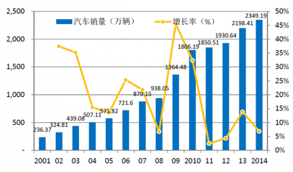 商品車物流與商品車銷售直接相關,受到近年來我國汽車消費市場快速增長的影響,商品車物流業(yè)務得到快速的發(fā)展。2001 年至2014 年,我國汽車銷量從236.37 萬輛上升至2,349.19 萬輛,同步帶動了商品車物流市場的擴大。