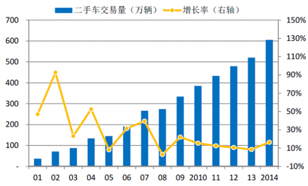 核心提示:從長期來看,新車銷售市場增速趨緩是必然的趨勢,然而不斷上升的汽車保有量將帶來巨大的二手車交易市場,未來二手車交易必將成為汽車消費的重要組成部分。目前我國二手車市場交易量逐年穩步上升。2001 年至2014 年,我國二手車交易從37 萬輛上升從長期來看,新車銷售市場增速趨緩是必然的趨勢,然而不斷上升的汽車保有量將帶來巨大的二手車交易市場,未來二手車交易必將成為汽車消費的重要組成部分。目前我國二手車市場交易量逐年穩步上升。2001 年至2014 年,我國二手車交易從37 萬輛上升至605.29 萬輛,不斷增長的市場促使汽車物流企業加強了對二手車物流項目的投資力度。