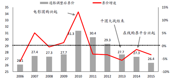 通過通脹調整后的票價顯示2010 年之后觀影票價一直處于下降通道