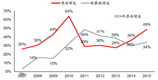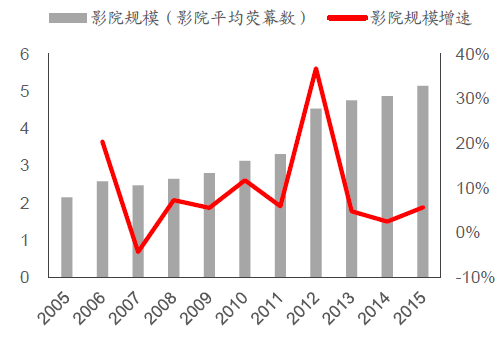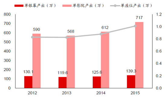 票房增速和銀幕年增速在2014 年發生逆轉標志著單銀幕產出開始回升