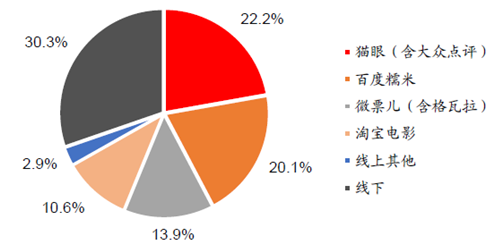 票價在2010年以后走勢基本取決于線上渠道的補貼情況,未來或逐漸企穩。2010年全國平均票價觸及頂峰之后一路下行,主要源于團購網站和在線購票平臺的補貼政策壓低了整體票價。電影購票為整條產業鏈上最為標準化和高頻的環節,因此從2011年起各類互聯網巨頭都以補貼切入這一環節。2013年底,千團大戰結束,只剩下了美團、糯米等幾個寡頭玩家,票價顯示出企穩跡象。但伴隨著貓眼(2013年剛成立)、微票兒(2014年啟動)等在線購票平臺接過“補貼”大旗,票價在2014、2015年再度下行。目前我國2/3以上的出票依賴線上,同時在線購票平臺也基本形成寡頭壟斷形勢。未來1-2年后票補想兇狠程度將有所下降,帶動電影票價企穩。