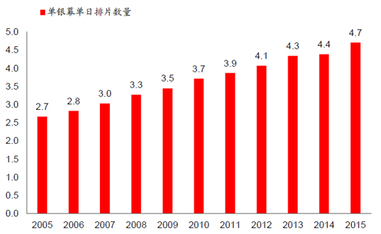 銀幕的利用效率從2005年開始翻了將近1倍,從2005年的單日單銀幕排片2.6場達到2015年每塊銀幕單日排片4.7場左右。而影院的工作時間一般是上午9:00至晚上23:00,單日屏幕的運轉時間極限值約為12-15個小時,以目前單片耗費2.5小時(計入檢票、清理等時間)左右來計算,單屏幕利用的極限值約在5-6場,未來增量空間有限。