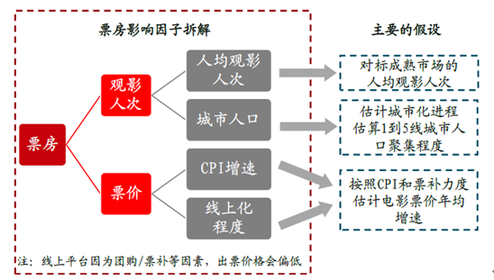 電影票房的基本公式為“票房=觀影人次X票價”,觀影人次由觀影人群基數(城市人口)和人均觀影次數(個人的觀影熱情)決定的;票價的影響因素較為復雜,主要影響其的因素包括物價水平(CPI)和線上補貼的程度。測算的關鍵在于人均觀影人次的估計,基于我國幅員遼闊,區域存在明顯的階梯差異,按照1至4、5線城市對觀影人次進行分層,分別對標成熟市場的各個階段,得到全國平均觀影人次。