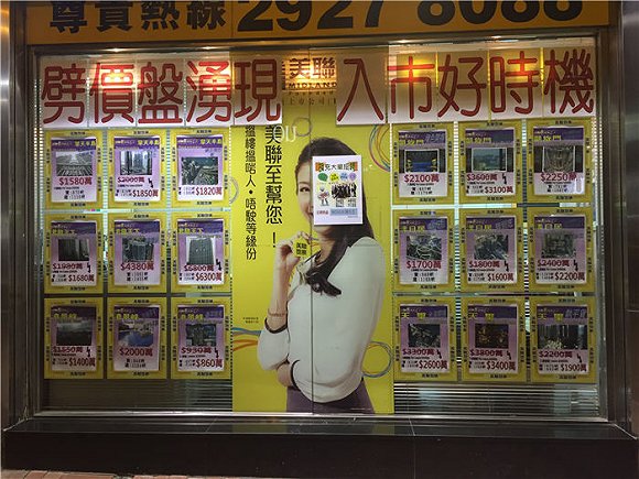 盛夏的香港,各類花花綠綠“劈價盤”占據了街頭的廣告櫥窗:一個又一個樓價數字被馬克筆劃去,標上醒目標簽——“機不可失”、“一劈再劈,再降20%”。一位中介公司的銷售人員正在用蹩腳的普通話向路過駐足的內地客人賣力推介,“這是這套房第三次降價了,絕對超值,有意不如去看看。”他強調,香港的樓價已跌至底部,但長遠仍看漲,此時正是入手的好時機,一旦錯過,必將后悔。