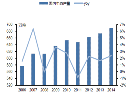2006-2014年中國牛肉產(chǎn)量變化趨勢圖