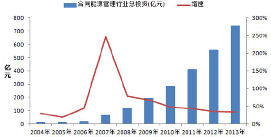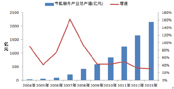 在節能減排政策壓力下,近年來我國節能服務產業取得了快速的發展,合同能源管理行業投資額度不斷增加。根據Wind資訊數據顯示,我國節能服務產業產值從2004年的33.6億元增長到了2013年的2,155.6億元,年均復合增長率為58.78%。作為節能服務產業發展的主要模式,合同能源管理市場發展迅速。根據Wind資訊數據顯示,2004年至2013年期間,我國合同能源管理總投資額從11.0億元增長到742.3億元,年均復合增長率為59.71%,節能量2,559萬噸標準煤,占2013年全國節能能力目標(6,000萬噸標準煤)的42.65%。