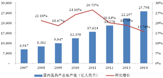 中國是全球大的新興市場,我國經濟經歷了幾十年的高速成長,居民收入水平顯著提高,居民可支配收入逐年增長。隨著人民生活水平的改善,我國居民對健康問題日益重視,醫療衛生服務需求顯著提高,國內醫藥行業保持快速增長。 據國家統計局統計,2014 年,我國醫藥產業主營業務收入、對外貿易總額、實現利潤總額繼續保持穩定增長,總體呈現平穩發展態勢。全年累計實現醫藥工業總產值 25,798 億元,同比增長 15.70%左右,2007 至 2014 年期間醫藥工業總產值年復合增長率達到 20.69%。2007 至 2014 國內醫藥產業總產值如下: