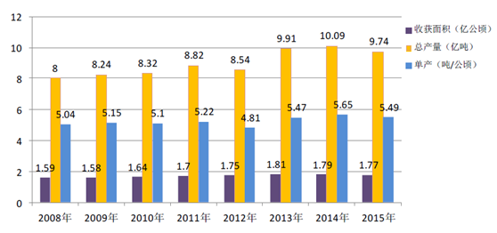 玉米生產的發展主要體現在種植面積的擴大,單產水平的提高,兩相作用致使玉米總產量增長。根據美國農業部統計,2008年—2015年世界玉米的收獲面積、總產量及單產情況如下:
