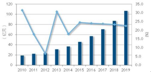 中國(guó)銀行IT解決方案市場(chǎng)投資規(guī)模及增長(zhǎng)率,2010-2019