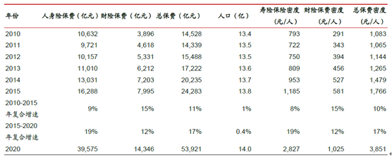 面對與國際市場的差距,除了險企本身加緊發展打開空間外,監管也對保險行業的未來發展設定目標。2014年8月,國務院出臺“新國十條”提出了要將商業保險的地位升級為社會保障體系和金融體系的重要支柱,同時提出在2020年保險深度達到5%,保險密度達到3500/人的目標。根據政策指引與我國保險行業的現狀與成長空間推算,預計到2020年總保費年復合增長率預計將達到17%,其中人身險年復合增長率預計將達到19%,財產險年復合增長率預計達到12%,而增長率曲線將隨著市場競爭日益激烈市場日益飽和呈現出S型。預計今年人身險保費增速將超過25%,財產險保費增速將超過12%.