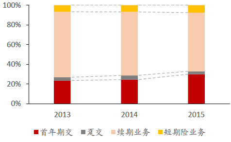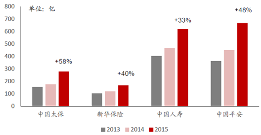 長期期交產品銳增,拉長負債久期增厚價值。首年期交保費大幅增長,在緩解給付風險的同時給保險公司帶來穩定的現金流入,極大的提升了保險公司的內含價值,為險企的持續發展積蓄能量。其中,中國太保2015年首年期交保費增幅達到58%,同年中國平安、新華保險、中國人壽的首年期交保費增幅也分別達到了48%、40%、33%。在規模迅速擴大搶占市場份額和實現企業價值穩定增長兩項選擇上,四大險企選擇了后者,在市占率相對穩定的基礎上轉變增長方式,保持業務穩定。