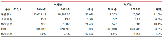 與國際成熟市場差距同樣預示著保險市場的高成長。2015年中國保費收入增速高于成熟市場,其中人身險市場保費收入16287.6億元,同比增長25%;財產險保費收入7995億元,同比增長11%。然而盡管發展迅速,我國保險市場的保險深度、保險密度還大大低于美國、日本、德國等發達國家。2015年中國人身險和財產險保險深度分別為2.4%、1.2%,低于海外成熟保險市場3倍;兩類險種的保險密度分別為1185元、581元,分別低于海外成熟保險市場10倍、25倍。我國保險市場尚未完全打開,保險意識有待開發,向上向寬發展空間巨大。