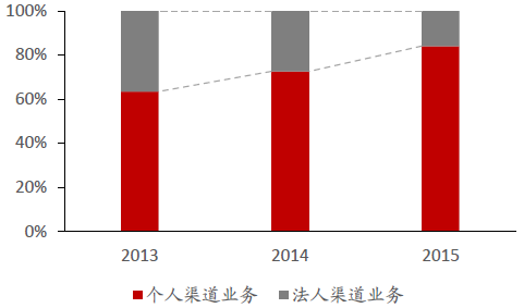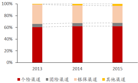 險企的大幅增員和營銷員產能的提高極大的推動了個險渠道收入增長。個險營銷員是長期期交產品和各類高利潤保險產品的重要銷售渠道,是內行價值穩定增長的重要抓手。2015年中國太保、新華保險、中國人壽、中國平安個險渠道實現保費收入913.4億元、513.5億元、2259.6億元,1954.5億元,同比增長27%、9%、10%、22%,個險渠道保費貢獻占比84%、88%、62%、46%,較去年同期增長11個、2個、0.02個、1個百分點。2015年個險渠道貢獻的首年期交保費占比達到了96%、59%、77%、98%,各險企已逐漸將渠道開發的重心轉移至個險上,個險渠道的增強將極大的推動長期起交保費的有效增長,延長獲利時間,擴大獲利空間,加速累積內含價值。