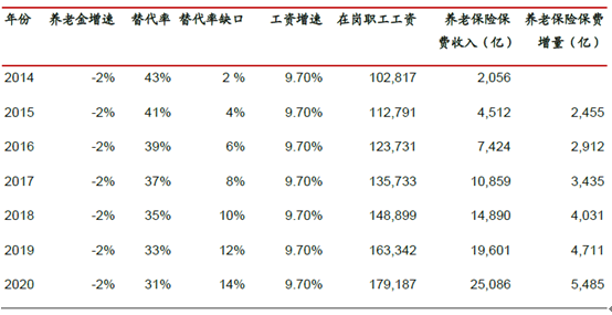 4、作為第二支柱的企業年金和第三支柱的商業養老保險將成為補充替代率缺口的重要補充力量。假設養老金替代率按照目前2%的增速下滑,將會在5年內出現10%的替代率缺口。根據歷史數字,工資增速大約會高于GDP增速3%,假設未來GDP年增速保持在6.7%,則工資增速為9.7%。按此推測,企業年金險和商業養老保險的年保費收入將會在2020年達到2.5萬億元,為2014年全年保費收入的兩倍,保費增量5千億元。