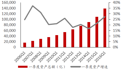 截止2016年一季度末,代表萬能險的未計入保險合同核算的保護投資款達到5969億元,同比增長213.6%,前值是39.3%。財產險原保費收入2154億元,同比增長8.9%,前值是12.7%。規模保費的迅速增長也應了資產規模的擴大,截止2016年一季度,資產總額達到13.8萬億元,同比增長27%,與2006年相比翻了7倍。以上因素的推動下,我國保險綜合競爭力全面提升,截止2015年底,我國已成為世界第三大保險市場。