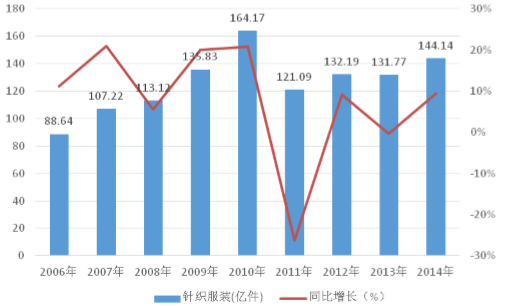 針織工業(yè)是我國紡織工業(yè)中產業(yè)鏈相對較為完整的行業(yè),隨著國內外市場的不斷擴大,我國針織行業(yè)近幾年都保持了較 快的發(fā)展。2006年針織服裝產量為88.64億件,到2014年增長至144.14億件, 累計增長 62.61%,年均復合增長率為 6.27%。